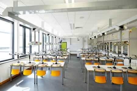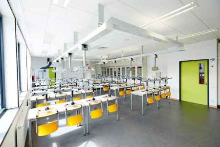 - Die naturwissenschaftlichen Räume sind im Gebäudeteil B zusammengefasst und durch eine standardisierte Ausstattung grundsätzlich von allen drei Naturwissenschaften (Biologie, Physik, Chemie) nutzbar.