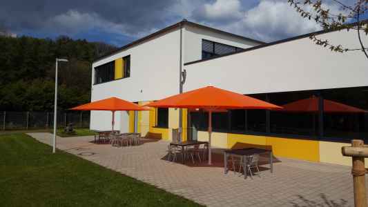 - Auf dem Schulhof stehen verschiedene Bewegungsangebote bereit; in den Mittagspausen können Spielgeräte ausgeliehen werden. Ebenso stehen den Kindern und Jugendlichen zwei Kleinspielfelder zur Verfügung. Es gibt auch einen Ruhebereich mit ausreichend Sitzgelegenheiten.