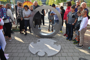 Seit 9 Jahren rollt der „Engel der Kulturen“, durch deutsche und europäische Städte. Es handelt sich dabei um ein Kunstwerk von Gregor Merten und Carmen Dietrich, das mit den Symbolen der drei abrahamitischen Religionen die Silhouette eines Engels erschafft. Viele tausend Kilometer ist dieser Engel also schon gereist, bevor er am Aggertal-Gymnasium kurz innerhielt, einen Sandabdruck hinterließ und begleitet von etwa zweihundert Schüler/innen zum Edmund-Schiefeling-Platz, der Christuskirche und schließlich zu dem Rathaus von Engelskirchen weiterzog, wo ein Abdruck als Bodenintarsie verewigt wurde.
