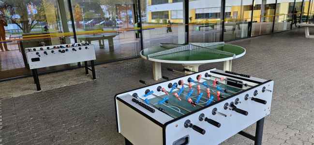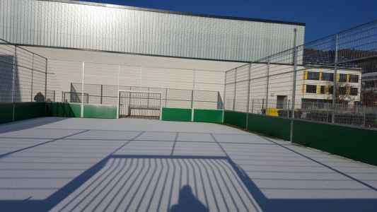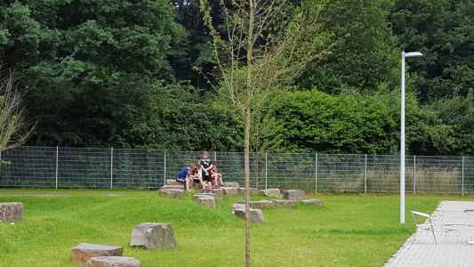 - Auf dem Schulhof stehen verschiedene Bewegungsangebote bereit; in den Mittagspausen können Spielgeräte ausgeliehen werden. Ebenso stehen den Kindern und Jugendlichen zwei Kleinspielfelder zur Verfügung. Es gibt auch einen Ruhebereich mit ausreichend Sitzgelegenheiten.