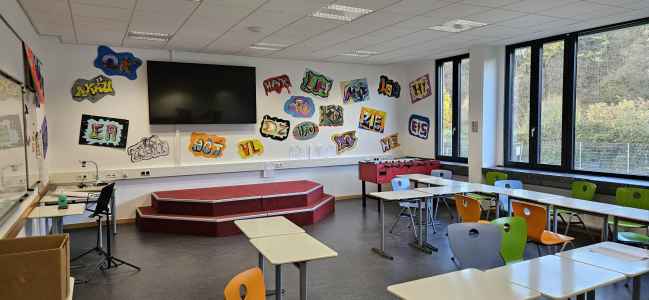 - Die Klassenräume der Sekundarstufe I sind zu Jahrgangsclustern zusammengefasst und alle Cluster im Gebäudeteil D angeordnet. Zu einem Cluster gehören drei Klassenräume, ein Differenzierungsraum und eine offene Lerninsel. Die Schülerinnen und Schüler bleiben die gesamte Jahrgangsstufe I in ihrem Klassenraum bzw. ihrem Cluster beheimatet.